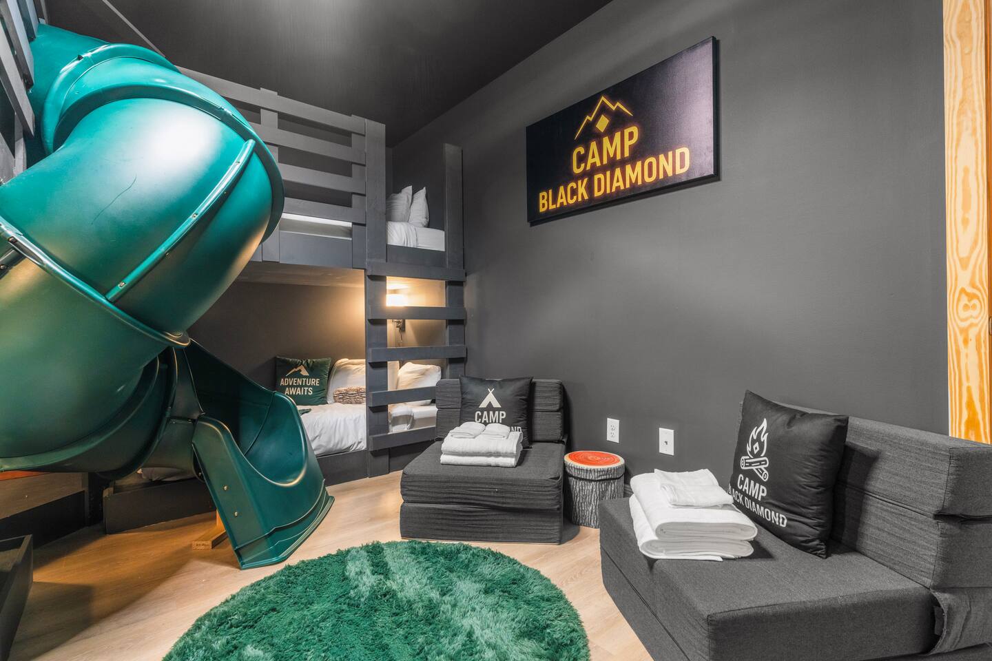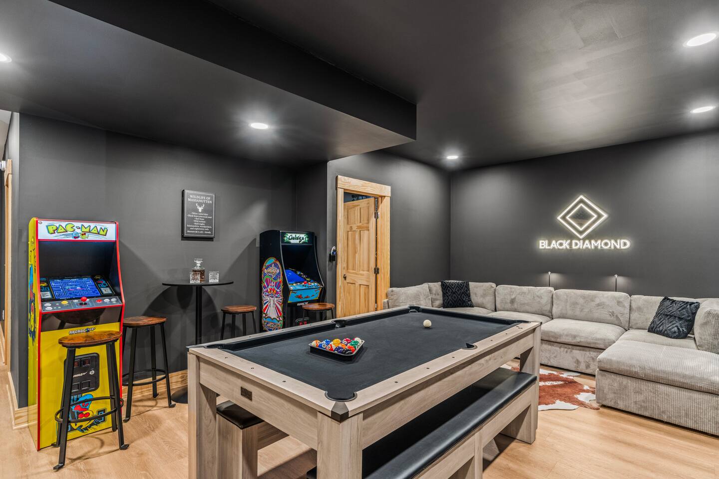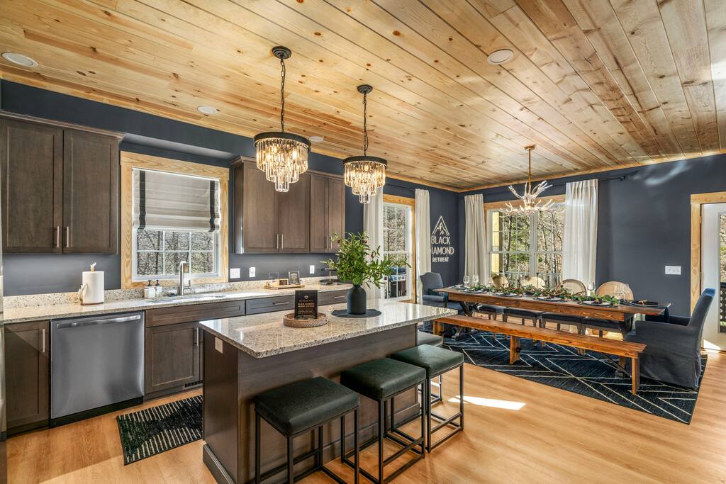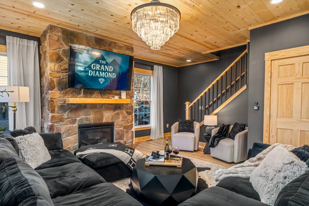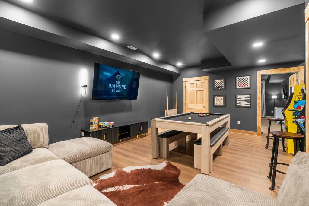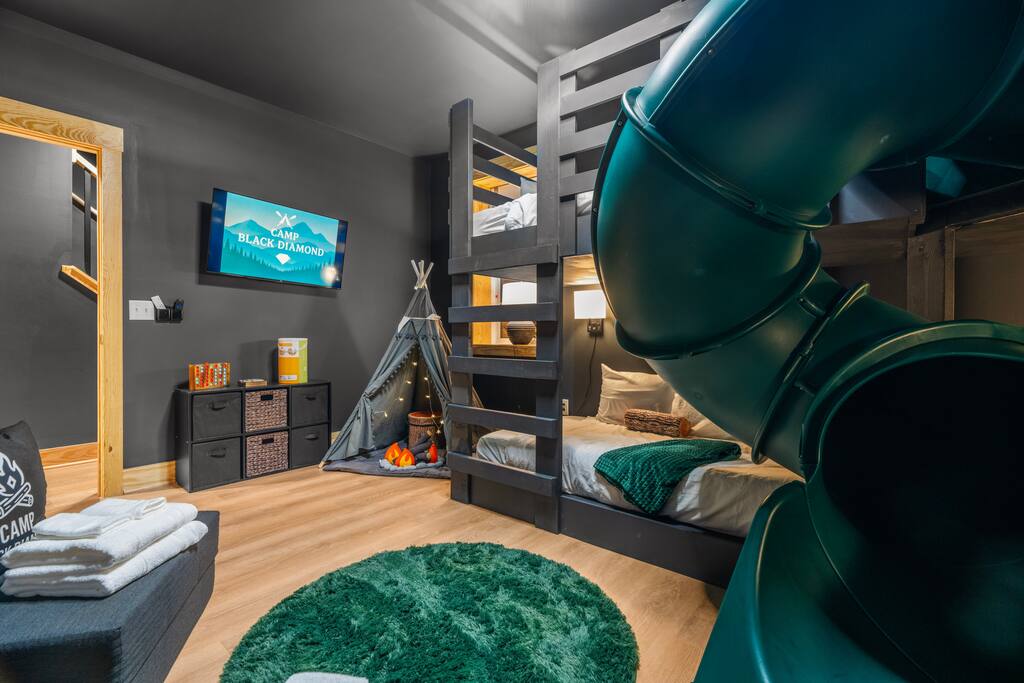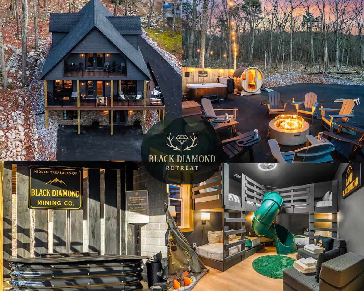 The Black Diamond Retreat is a moody-luxury mountain escape crafted for gatherings. With 7 spacious bedrooms, custom bunk spaces, and expansive living areas, it was designed with luxury in mind. Guests enjoy a hot tub, barrel sauna, arcade-style game room, EV charger, and family-friendly extras—all wrapped in bold mountain style. Just minutes from Massanutten’s slopes, waterpark, golf, and hiking, it’s the perfect place to relax, connect, and make memories