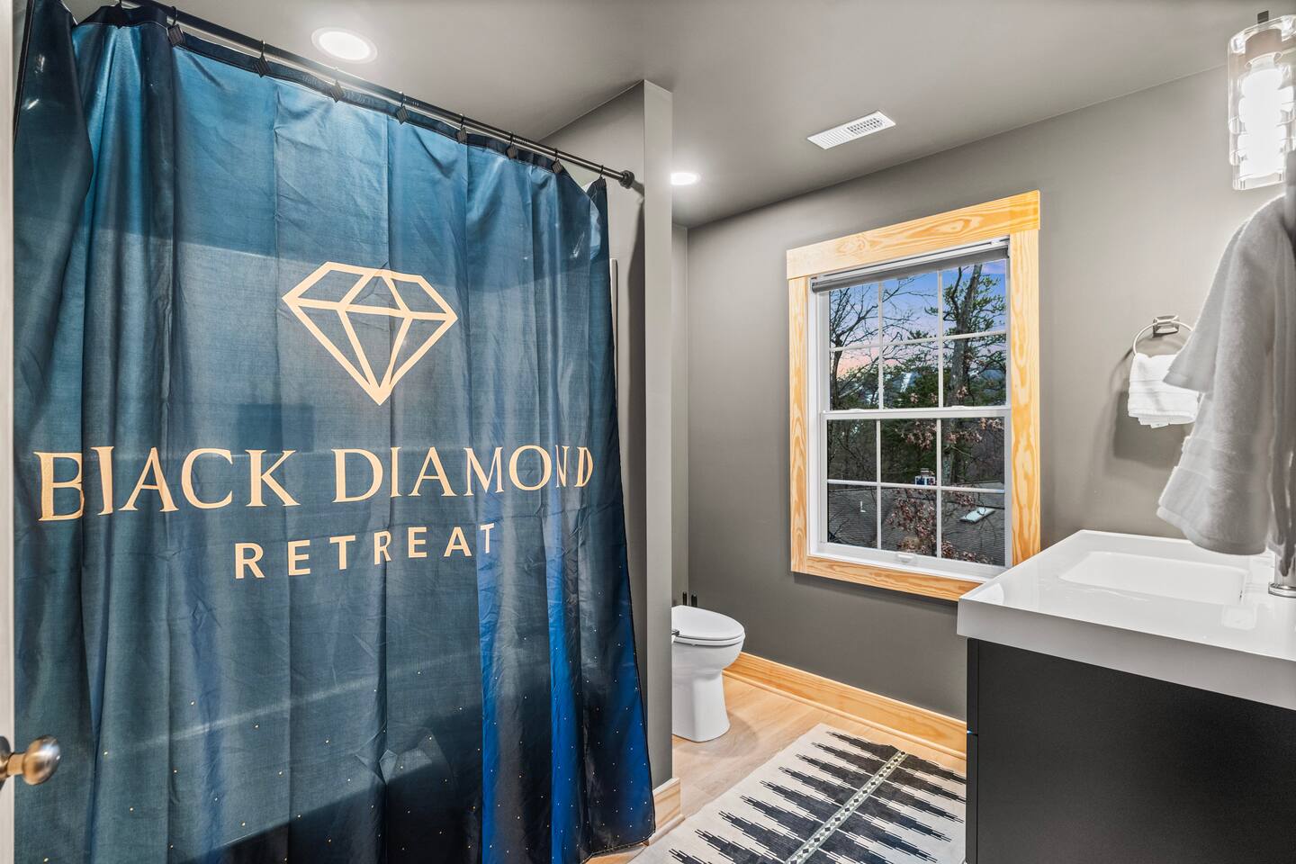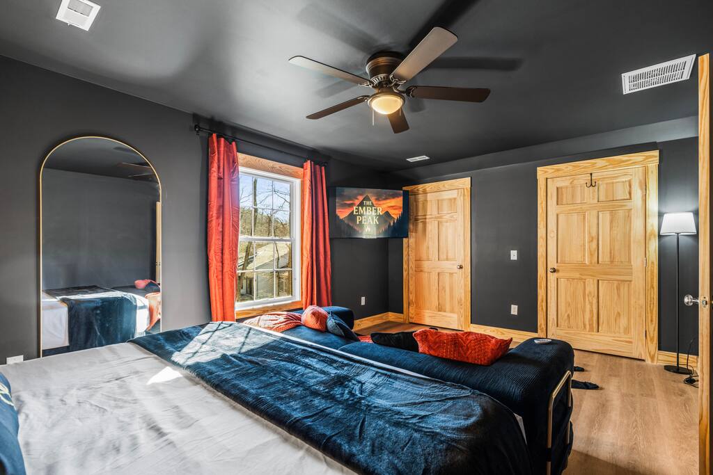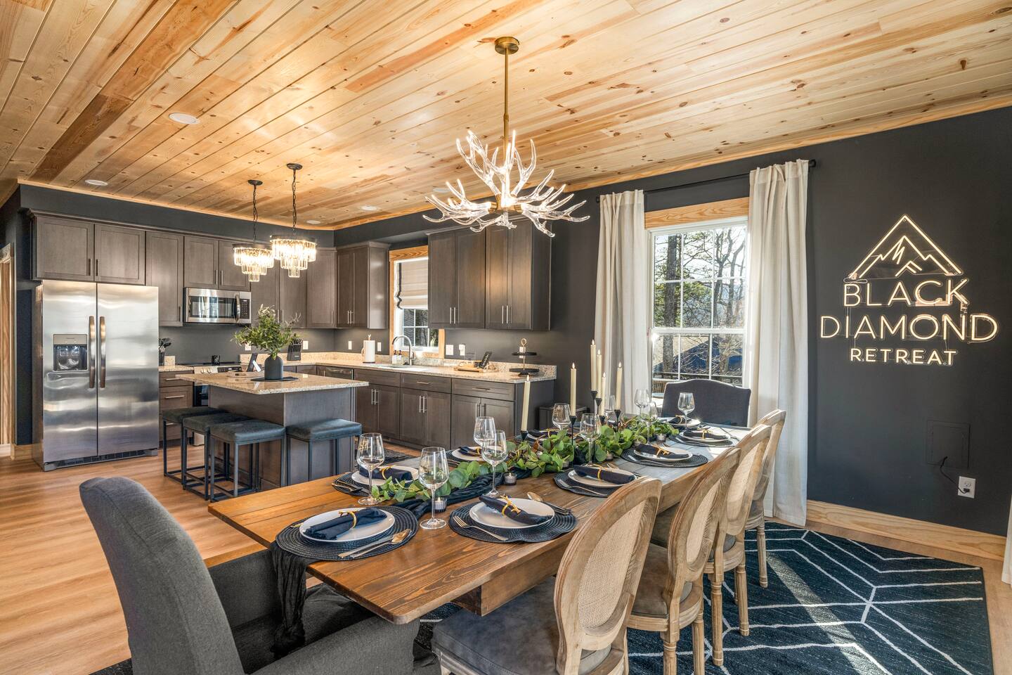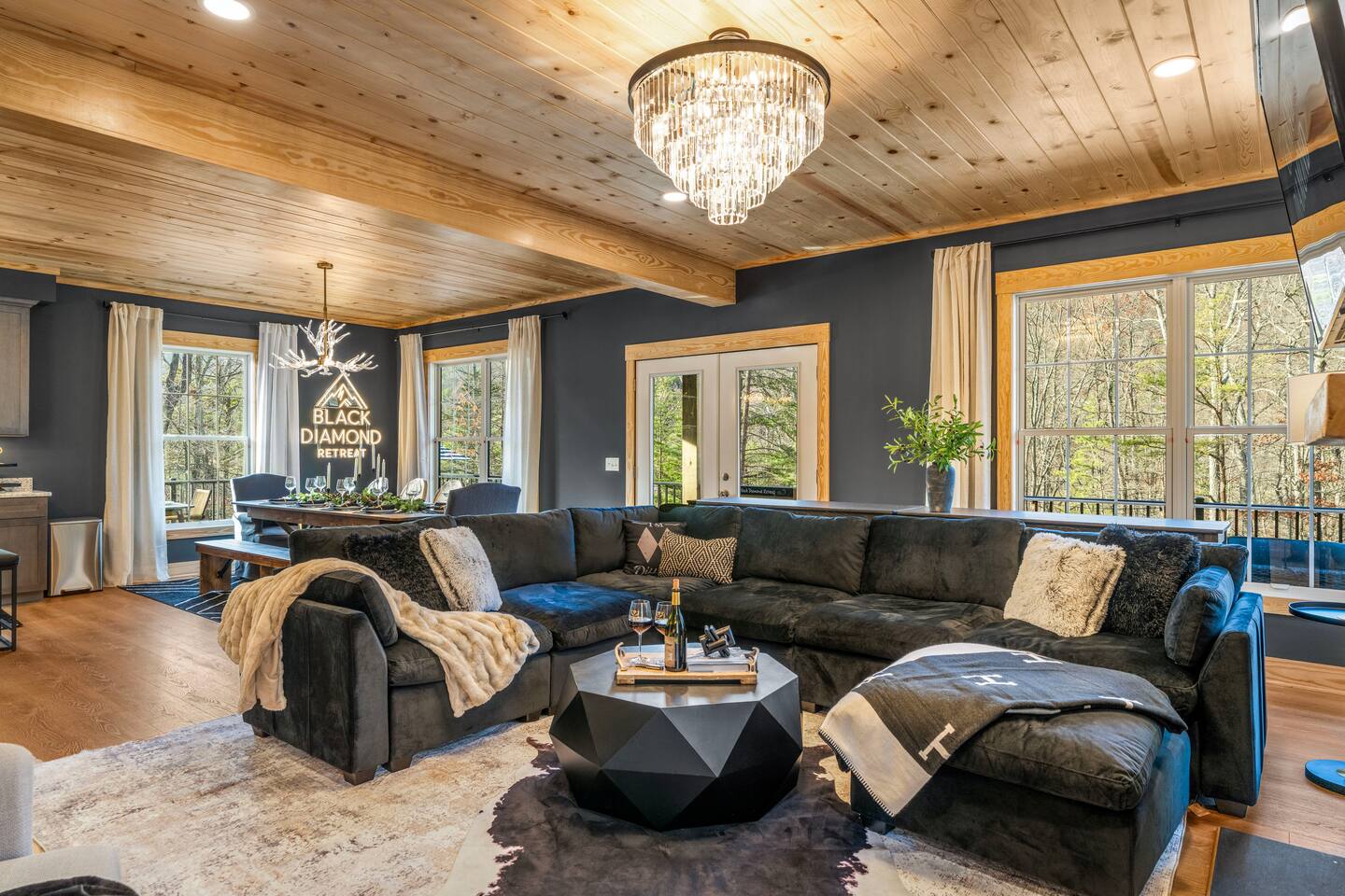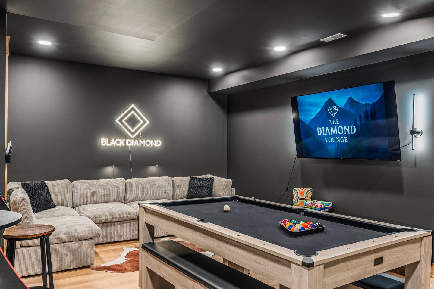 The Black Diamond Retreat is a moody-luxury mountain escape crafted for gatherings. With 7 spacious bedrooms, custom bunk spaces, and expansive living areas, it was designed with luxury in mind. Guests enjoy a hot tub, barrel sauna, arcade-style game room, EV charger, and family-friendly extras—all wrapped in bold mountain style. Just minutes from Massanutten’s slopes, waterpark, golf, and hiking, it’s the perfect place to relax, connect, and make memories