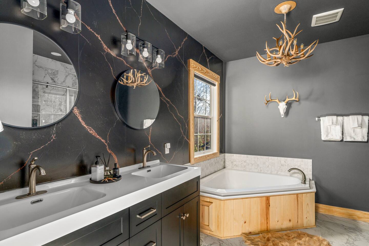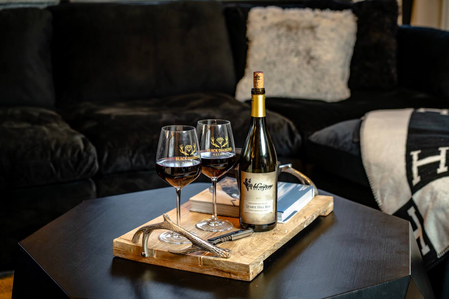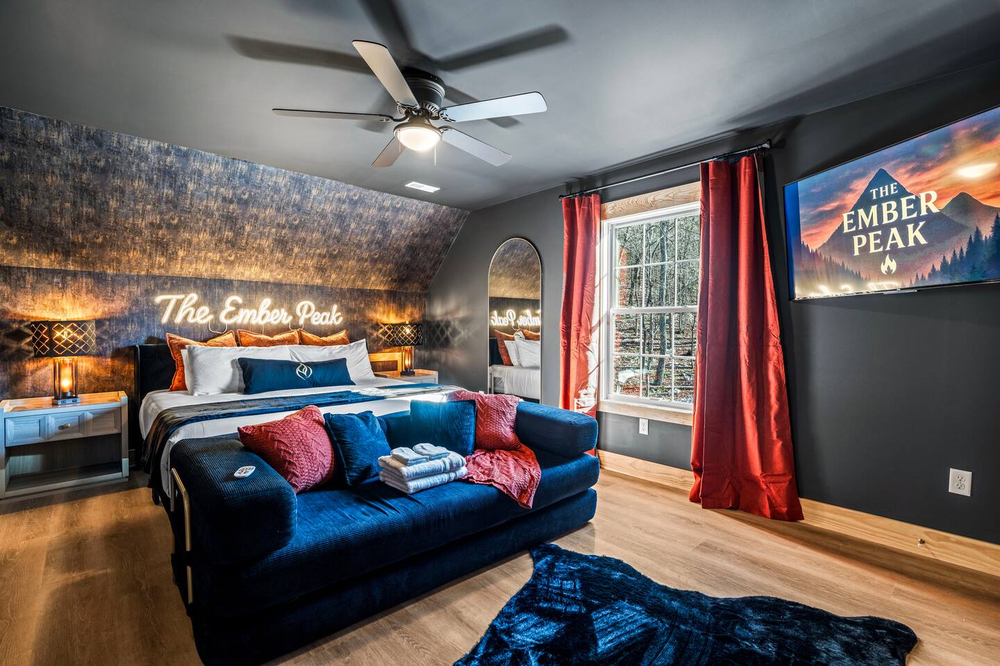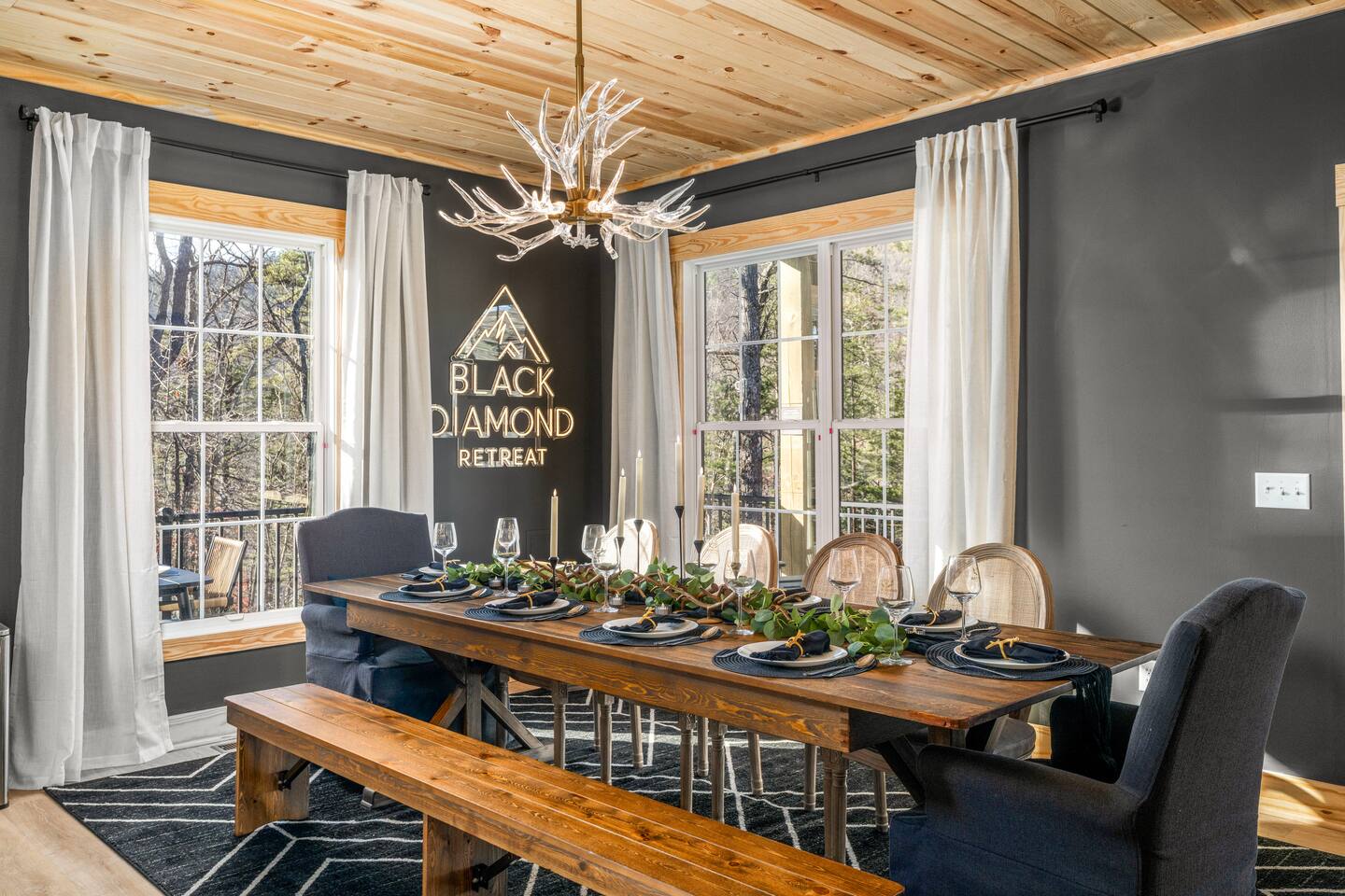 The Black Diamond Retreat is a moody-luxury mountain escape crafted for gatherings. With 7 spacious bedrooms, custom bunk spaces, and expansive living areas, it was designed with luxury in mind. Guests enjoy a hot tub, barrel sauna, arcade-style game room, EV charger, and family-friendly extras—all wrapped in bold mountain style. Just minutes from Massanutten’s slopes, waterpark, golf, and hiking, it’s the perfect place to relax, connect, and make memories